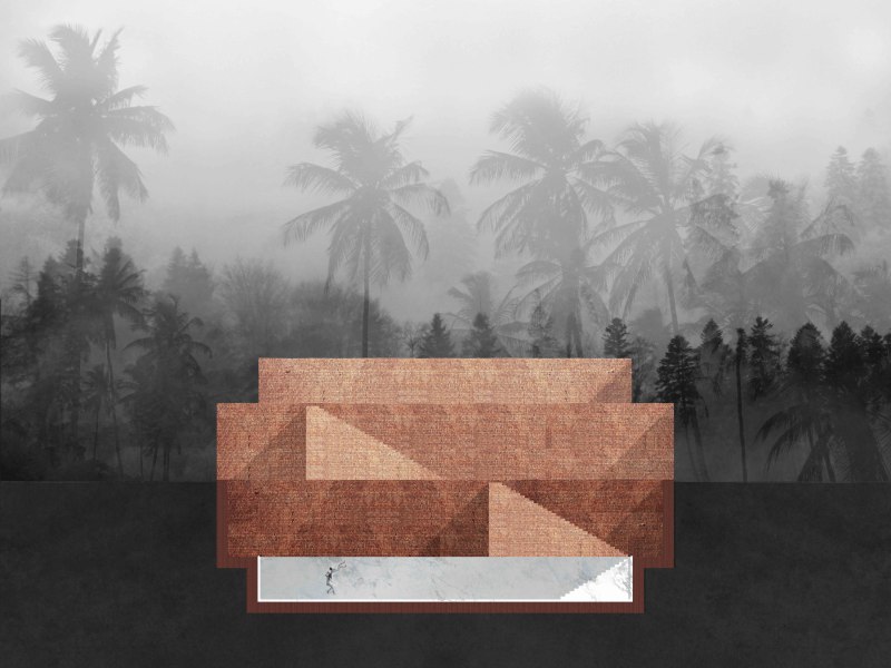 Using the motto ‘Tea House’, the idea of a Japanese tea house is translated into a pool for a private client in Mumbai. It is a place of ritual, desire and sanctity. It exists as the strong gesture of excavating a pool, and with this earth creating a mountain of fired bricks, in whose shadow one swims. The white granite which lines the pool reflects the idea of austerity of water. The drawing is a cross section which has been digitally rendered to represent the atmosphere of the project.