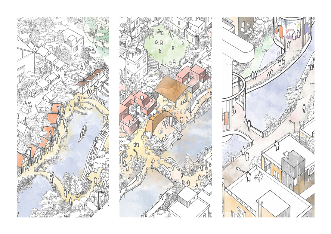 The intervention attempts to re-kindle the spirit of the canal by incorporating it into the daily lives of the local communities. The entire canal has been characterised into three stretches and each image represents how the re-animated Adiganga would locally respond to its surroundings.