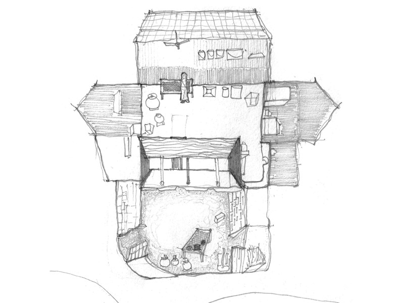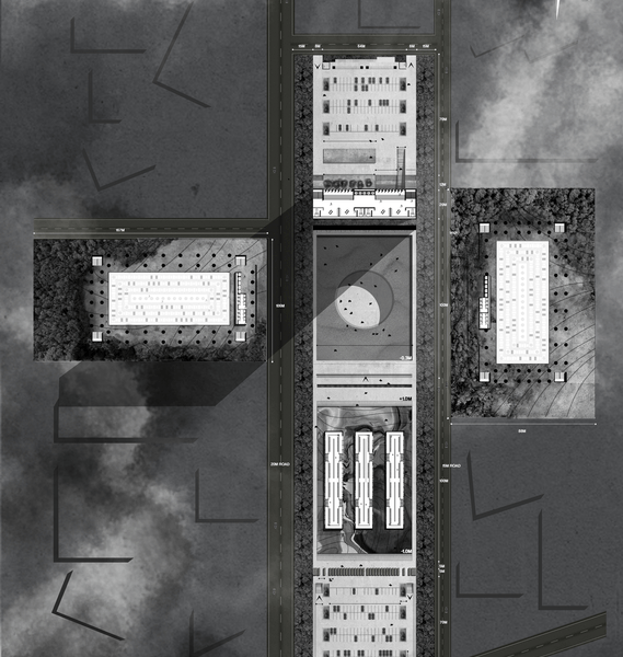 Image provided is the digital illustration of a site plan for the project, Architecture Among the Urban Dead. This illustration is the visual representation of monochromatic greys in the life which defines the neutrality and correlation between birth & death, good & evil, black & white. The harmony within the colours, the hierarchy between the geometries of the structure, and the layers of surrealism have been embedded consciously within the illustration.