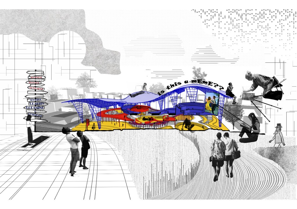It was created using a SketchUp base model and developed through layered digital sketching, collage, and textural rendering in Adobe Photoshop and Adobe Fresco.