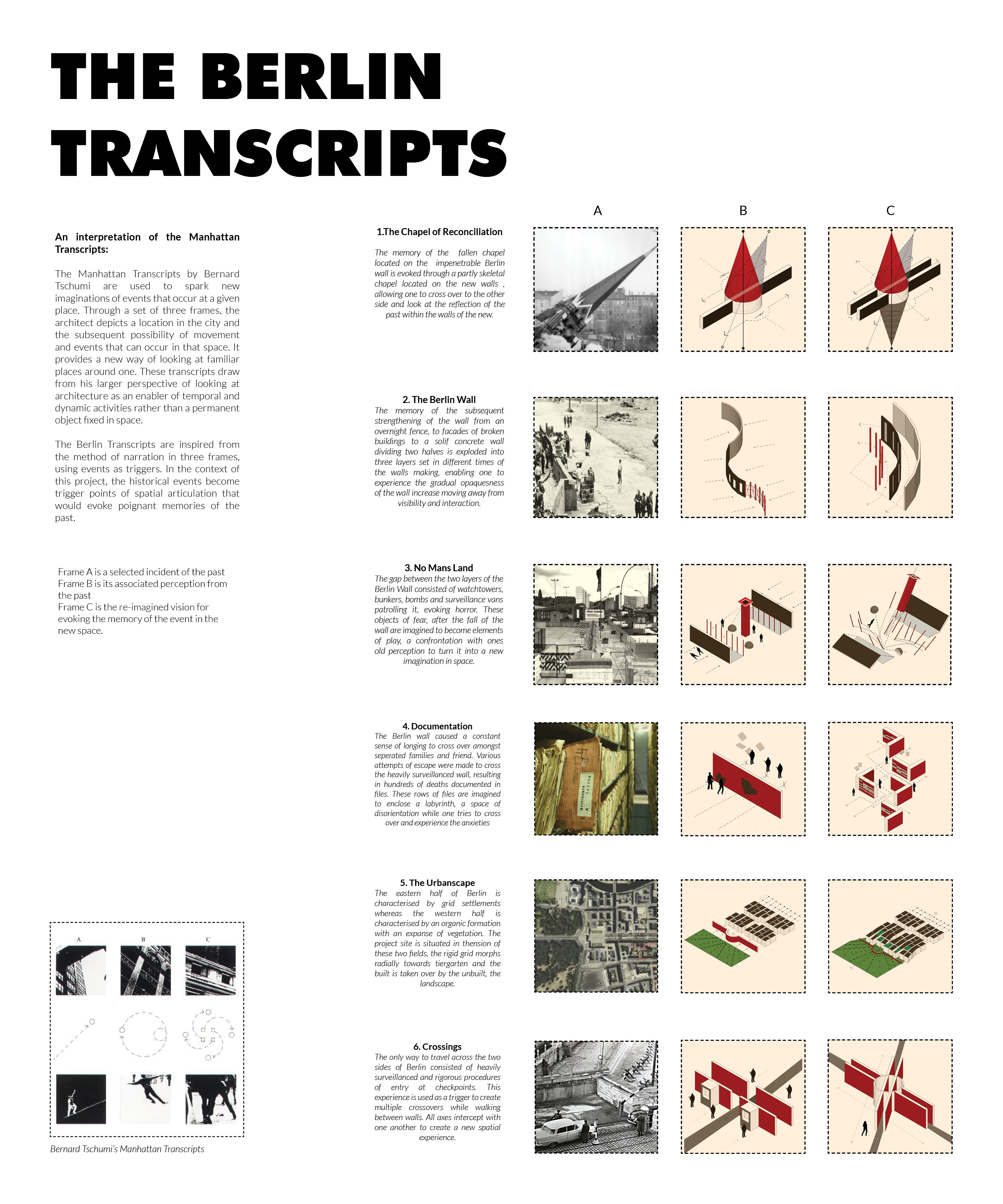 In exploring different methods of drawing, the intrinsic logic of manhattan transcripts sequencing the context, its present and the dynamic speculation became a useful tool in conveying the varied ideas associated with the project. These notations were re-interpreted to adapt to the design project while keeping Tschumi’s idea of using “events as triggers” intact. Here, events of history become triggers to evoke a new imagination for the present. Frame A sets the stage for decoding its own logic in Frame B and sparking a new reality in Frame C.