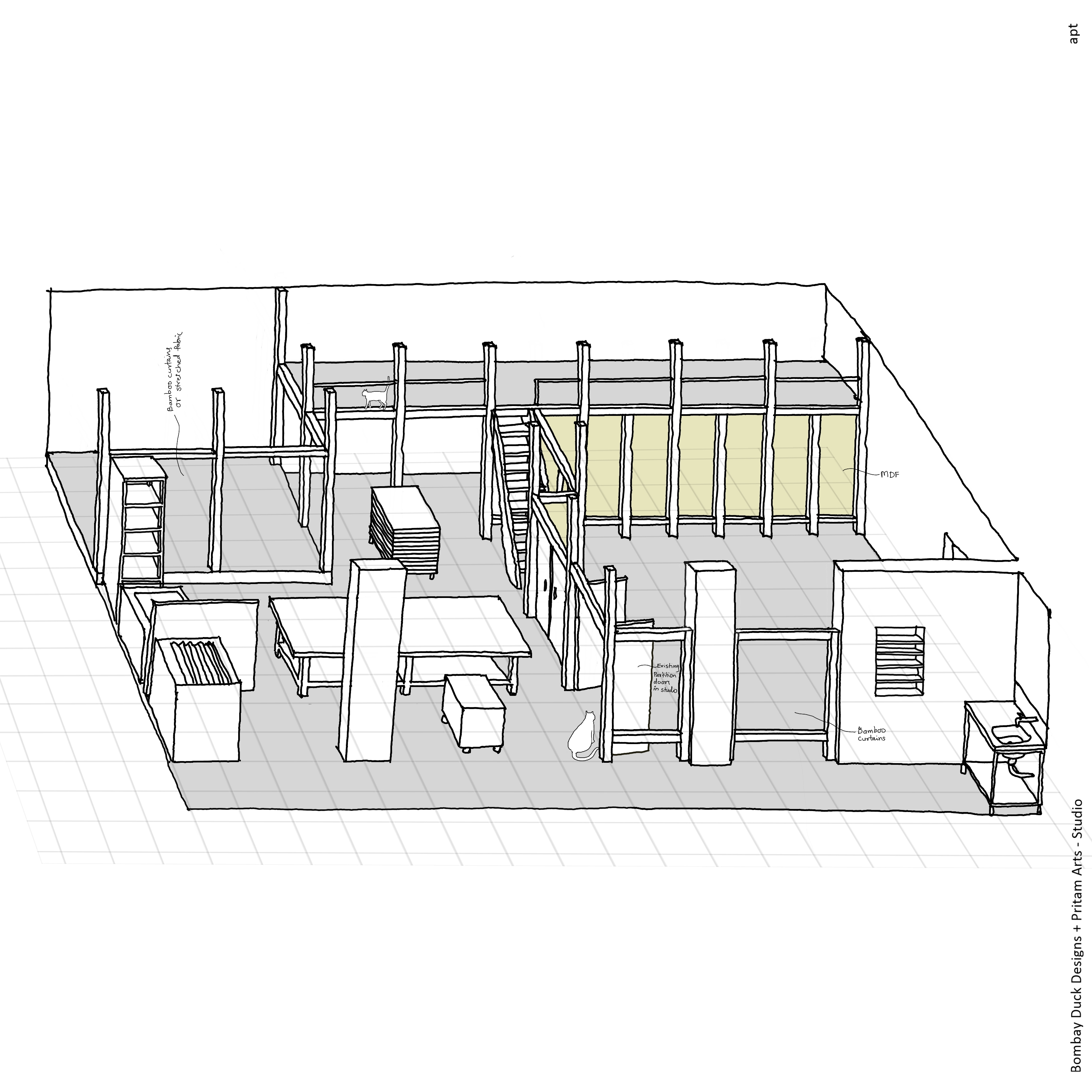 This studio shared by Sameer Kulavoor, Zeenat Kulavoor and Prajval Mendon is designed in such a way that it can be divided in three separate sections to function as a printing studio, graphic design studio and painting studio or it can be merged into a single space to be used for workshops or social events.