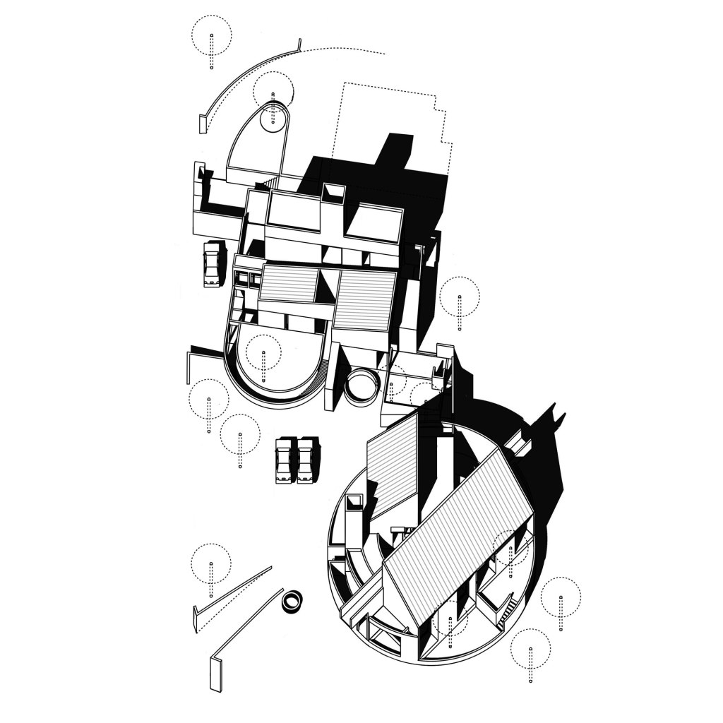 The drawing is a part of a series of digital black and white axonometric drawings, with deep sharp shadows falling from/onto the buildings. The built shown in the drawing are two distinct houses tailored for two brothers. The houses though distinct are connected by a court formed by connecting the various axes of the built. The surroundings have been blocked out from the drawing and certain elements are kept as dashed lines to compose and reveal certain details like the boundary of the house located on top of the drawing.