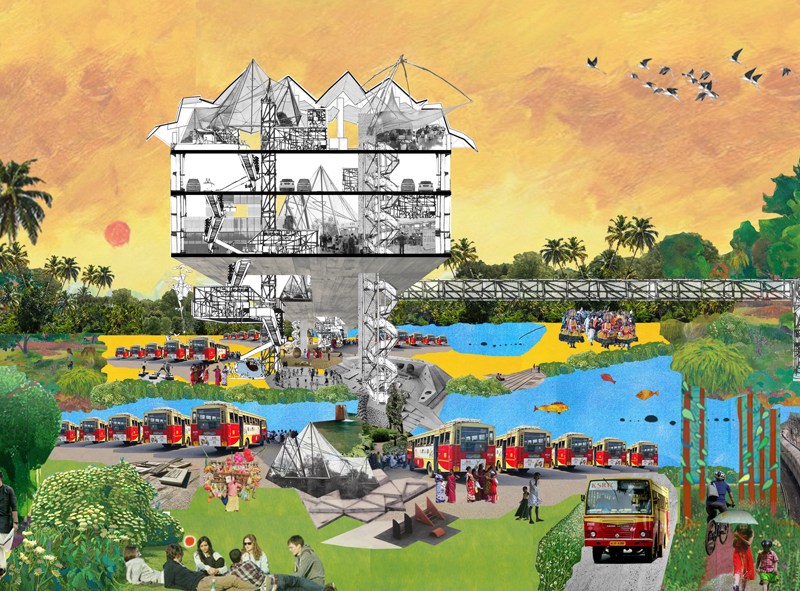 The Intervention of KSRTC bus depot here is imagined in detail combining complex programmes of the bus depot, vehicular parking, vibrant public place with multiple activities of recreation, art and health, active neighbourhood edge and constructed wetlands.