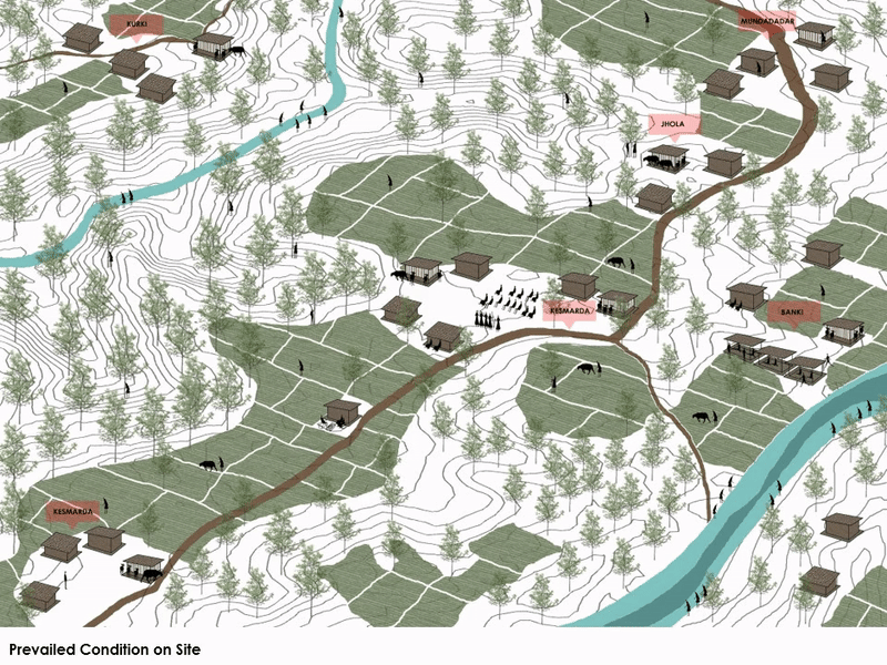 With an idea that ‘The Relationships foster and turn more Harmonious when people are better connected to their natural habitats, for their physical, psychological and spiritual health and well being’ a case of rural settlement suffering from the consequences caused by the man and nature conflict (Mining) was undertaken. The project revolves around the idea of regaining the lost relationship between Man – Nature caused by intensive Bauxite mining activities in the mountain ranges of Kawardha, Chhattisgarh. The interventions focus on uplifting the community along with making them capable of regaining the charm and beauty of the surrounding landscape by creating a platform for their culture and tradition to flourish.