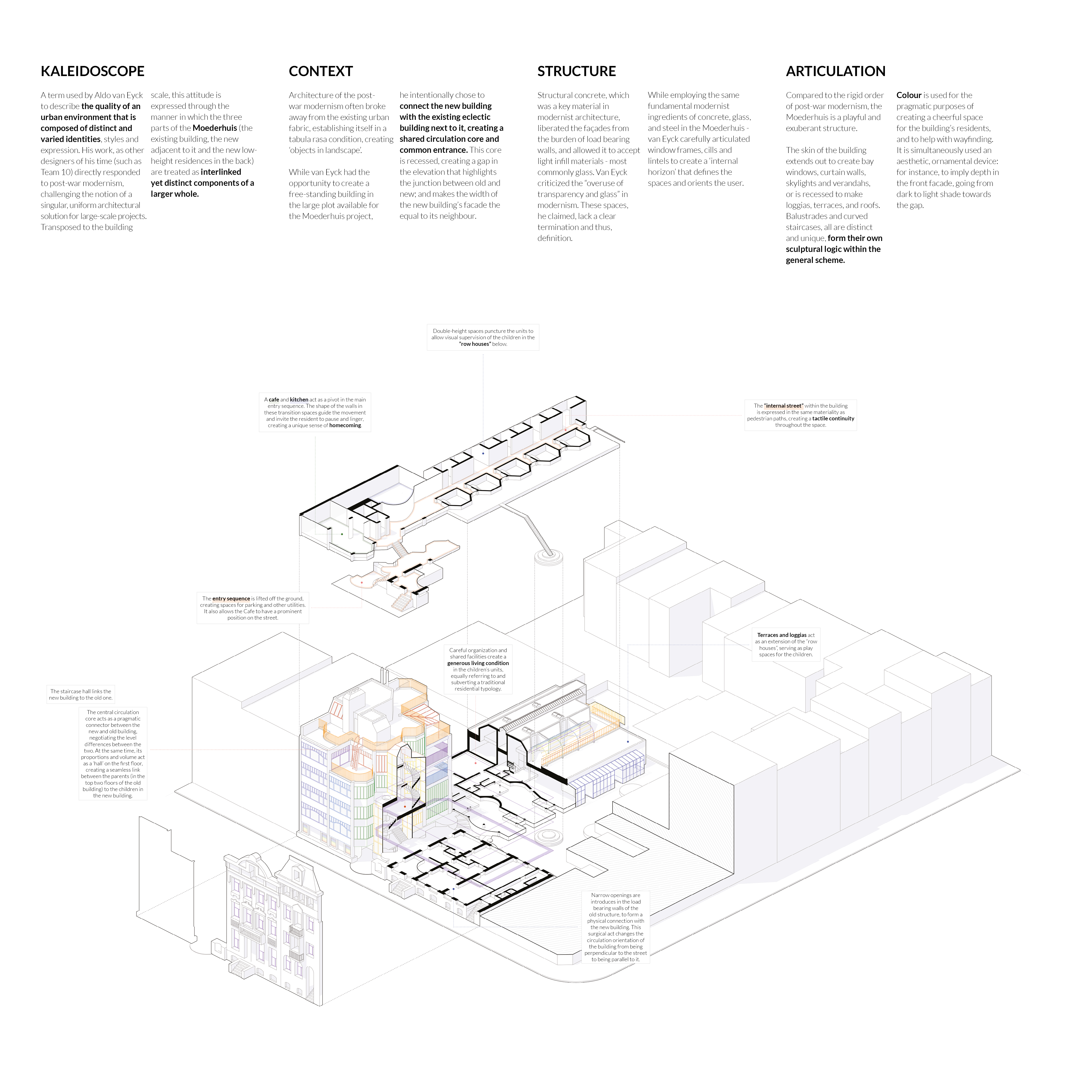 We study Aldo van Eyck’s Moederhuis (Amsterdam, 1978) as an architectural reaction to post-war modernism. Our analytical drawing aims to reveal multiple characteristics of this project in one composite image: depicting the complexity in spatial organisation and articulation by slicing and extracting segments of the building.