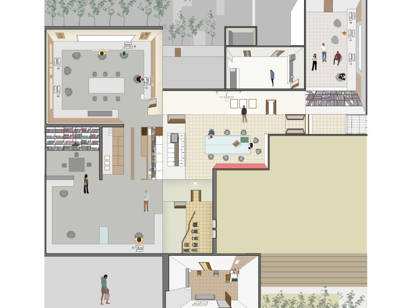In architectural premise, the act of drawing captured my interest since it plays many roles. It becomes a thinking drawing when we are drawing to find out. Whereas Richard Leplastrier gives a new lens to see and understand drawing. He says to draw is to pull out, to draw something out, to draw meaning out of our minds. Making illustrations was a similar exercise where I was trying to draw my memories out and put them onto the parchment. This is the illustration of the Hundredhands studio, where I did my internship. I have tried representing spaces the way I had experienced them; because of which nature of drawing changes very often. The spaces of the studio are pluralistic. Some spaces are cozy, like the library and some spaces were robust like the backyard. The backyard becomes full of life when children play around, and it also becomes a place for insightful conversation during leisure.