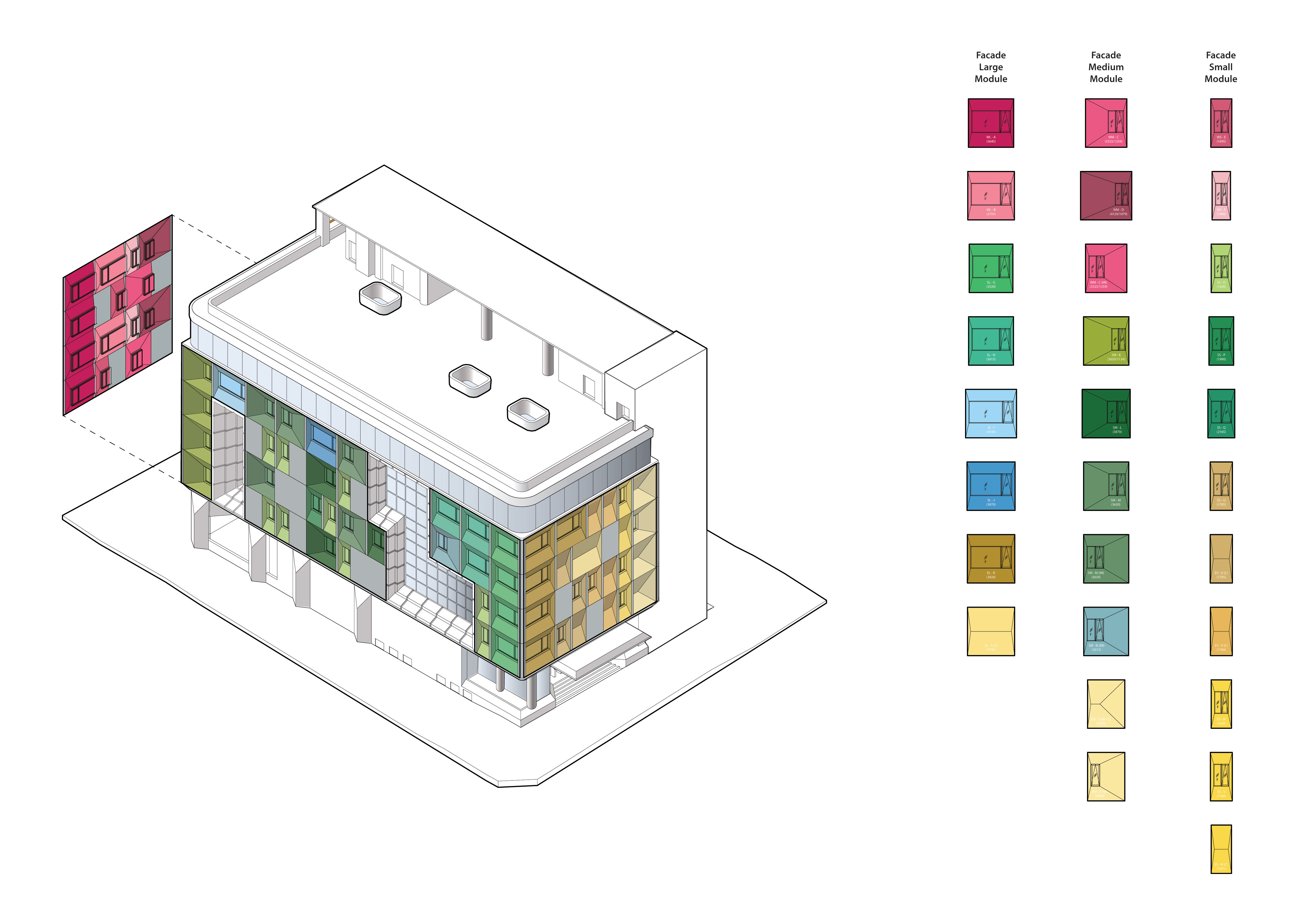 The primary façade envelops the building on three sides using inclined ceramic panels. The vertical air gap within the ventilated light-coloured façade serves to insulate the building from direct solar radiation, prevent condensation built up and reflect the majority of the incoming sunlight. The façade, segmented into 29 large modular types, is designed to optimise natural daylight penetration into the classrooms. Additionally, these inclined surfaces, coupled with recessed double-glazed windows, are strategically articulated to mitigate direct glare. The inclined form of these modules also addresses the client’s practical request to minimise ledges for birds to perch, considered a nuisance in the city’s context with their incessant bird droppings and chatter.