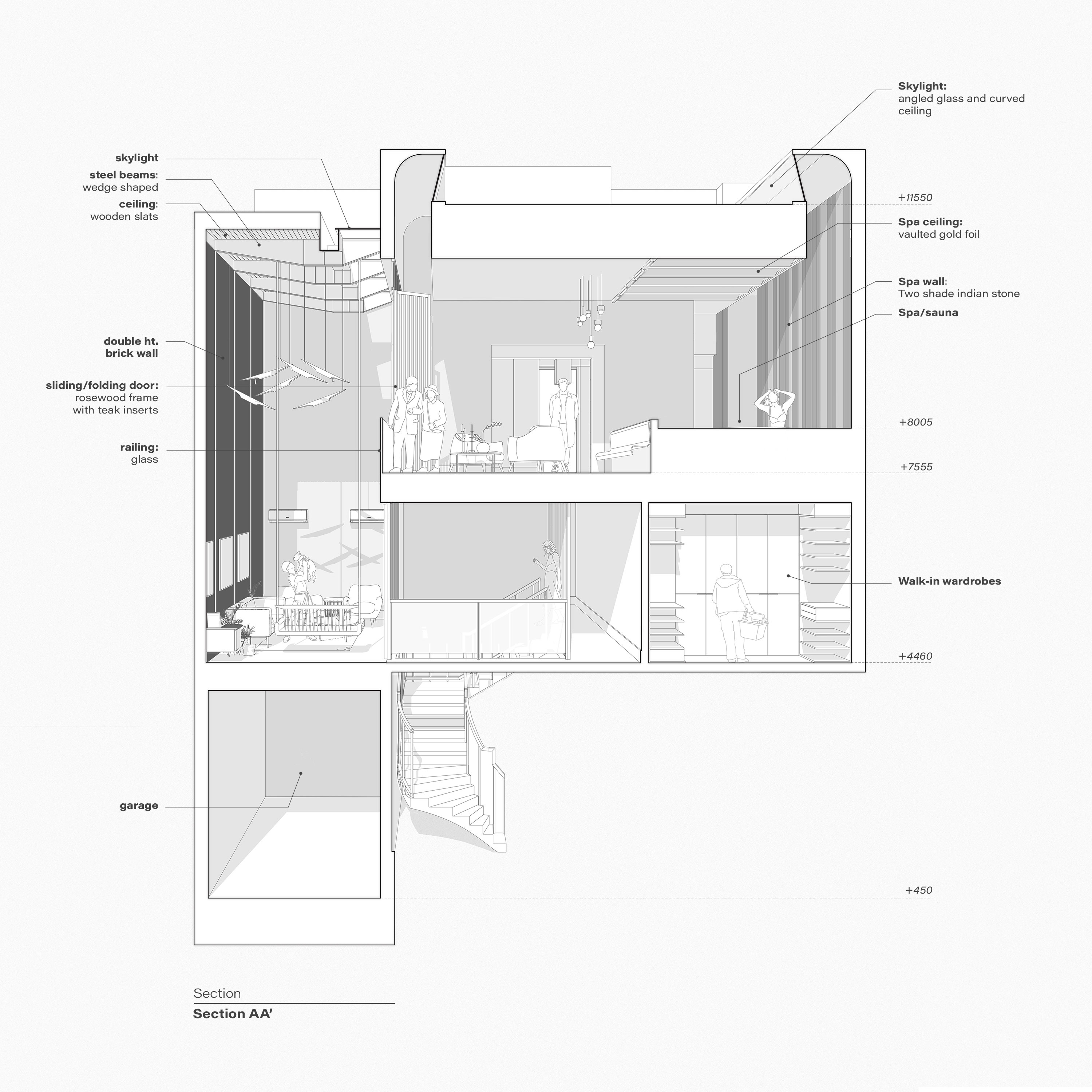 The folly home is a residential project in Gurgaon altering a semi-built early 2000s property to a modern home for a multi-generational family. To enhance familial ties, we realised the need to create spaces that fostered conversations and shared activities, resulting in a temporal double height steel structure crafted and placed over the existing driveway. All family rooms open to this inward-looking courtyard – flexible to meet evolving requirements and reinterpreting traditional typology in dense neighbourhoods. This section drawing highlights this exchange between the folly, and the rest of the living spaces along with the subtly differentiated uses of skylights.