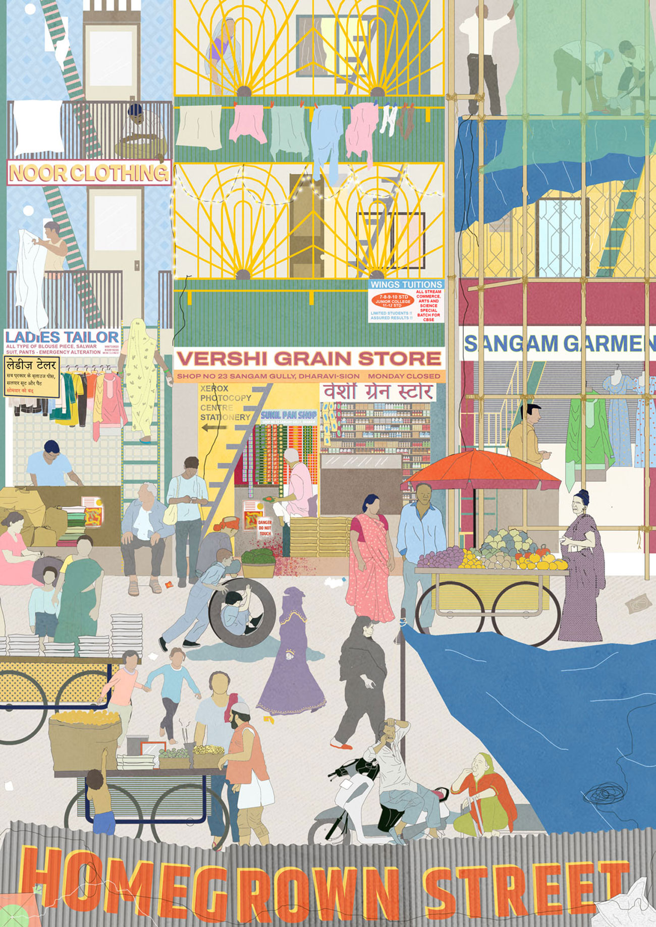 The illustrations capture the self-built urbanism/architecture of Sangam Gully in Dharavi, Mumbai. It is part of the Homegrown Street project, a tribute to the unrecognised talent of local contractors and artisans in Dharavi. The project spotlights the self–taught process of designing and building affordable and beautiful houses for themselves and their clients from marginal communities. It attempts to validate the Tool-House, an architectural typology which residents and contractors in high-density, mixed-use settlements create and maintain in their neighbourhoods. With urban ethnographic aesthetics, the illustration combines the architectural elevational style with narrative street scenes.