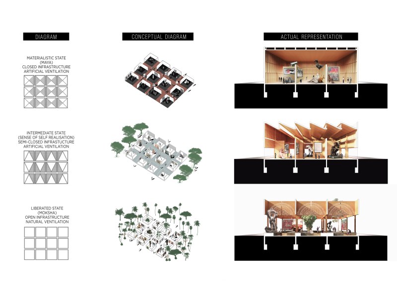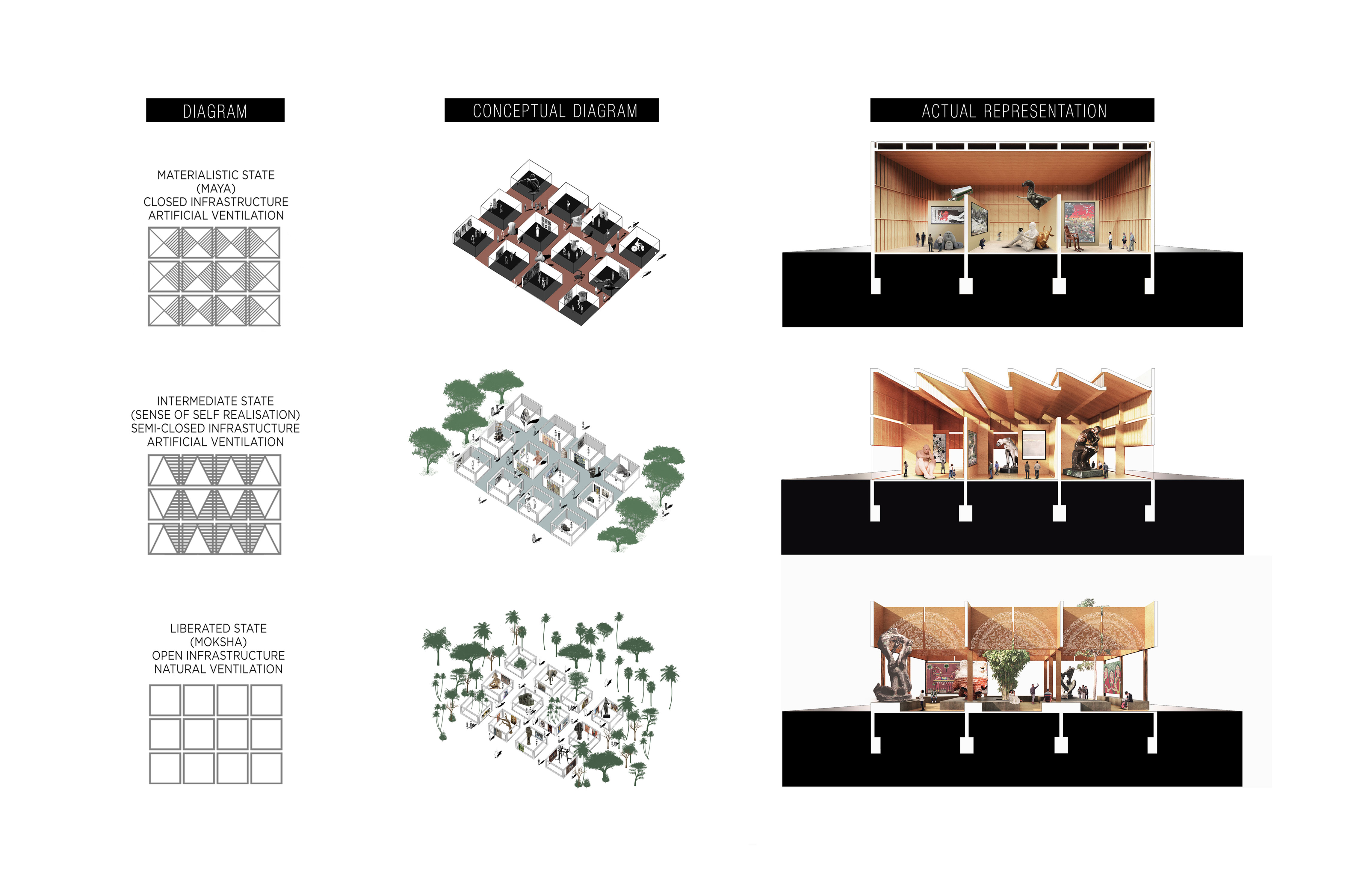 The image represents the whole thinking process of an architectural project in a single diagram. The diagram shows how a complex thought can be illustrated with the help of simple diagrams which can help viewers to understand the design in a more articulated manner. To produce such an image, AutoCAD, Adobe Photoshop and SketchUp has been used.
