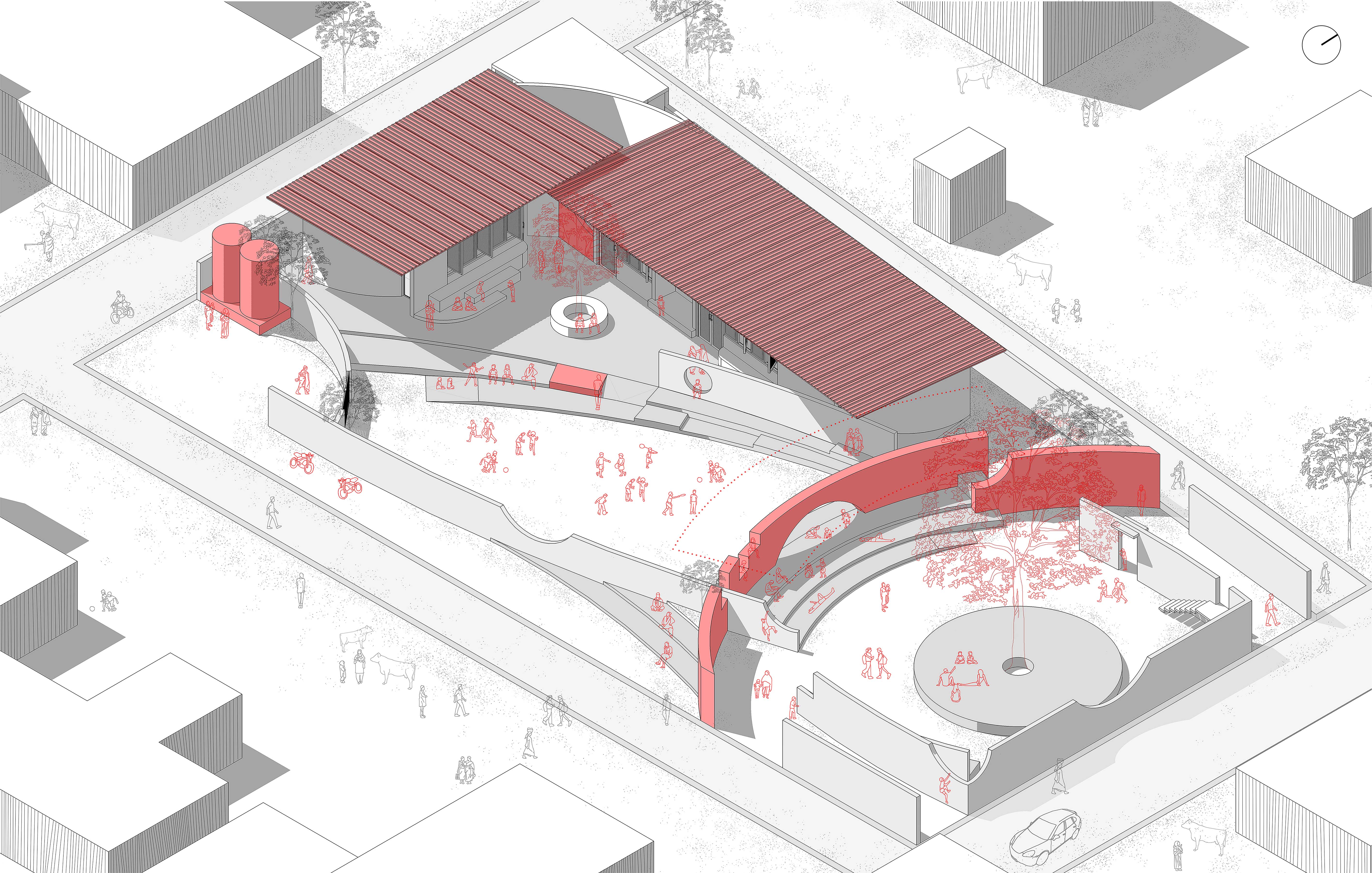 The site at Kodidoddi has a few salient features such as temporary shops, a water tank, and a large Neem tree. The people of Kodidoddi prefer gathering around the Neem tree and the water tank. This gives us an opportunity to carve out those spaces in the proposed intervention to retain its authenticity. This is what we call “Tracing memory”.