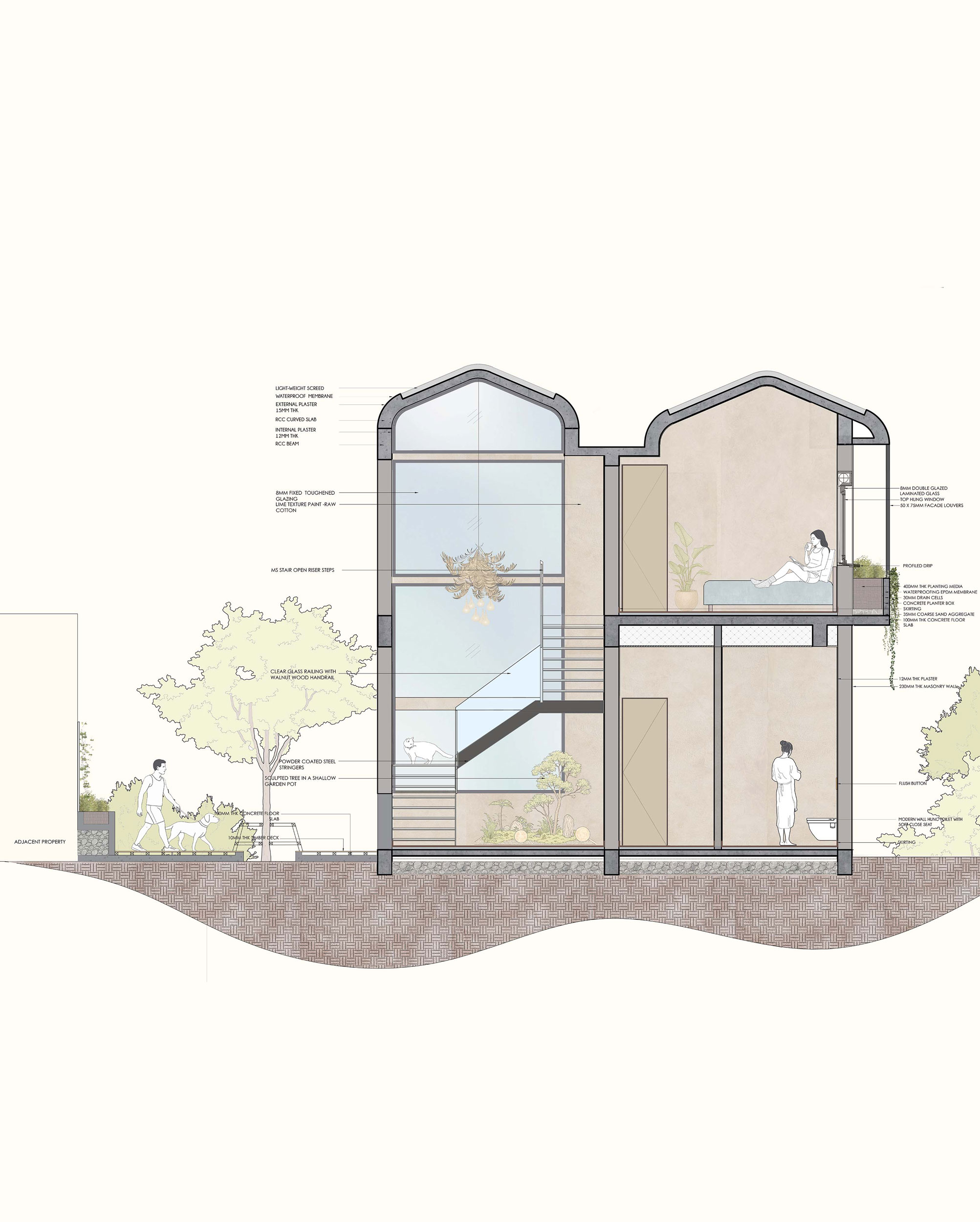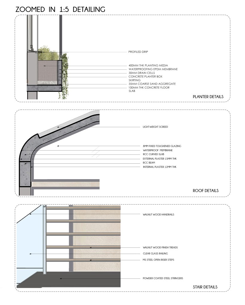 This sectional drawing captures a quiet interlude within Vagator Villas—a space where architecture negotiates with nature. The stairwell becomes a vertical spine, drawing in light and leading movement upwards, while the internal courtyard breathes life into the heart of the home. As the walls rise in grounded stillness, shadows of trees slip through openings, softening thresholds and inviting the outside in. Every element—from planter edge to bath volume—is detailed to honour both structure and silence, forming a built rhythm that listens, leads, and lingers.