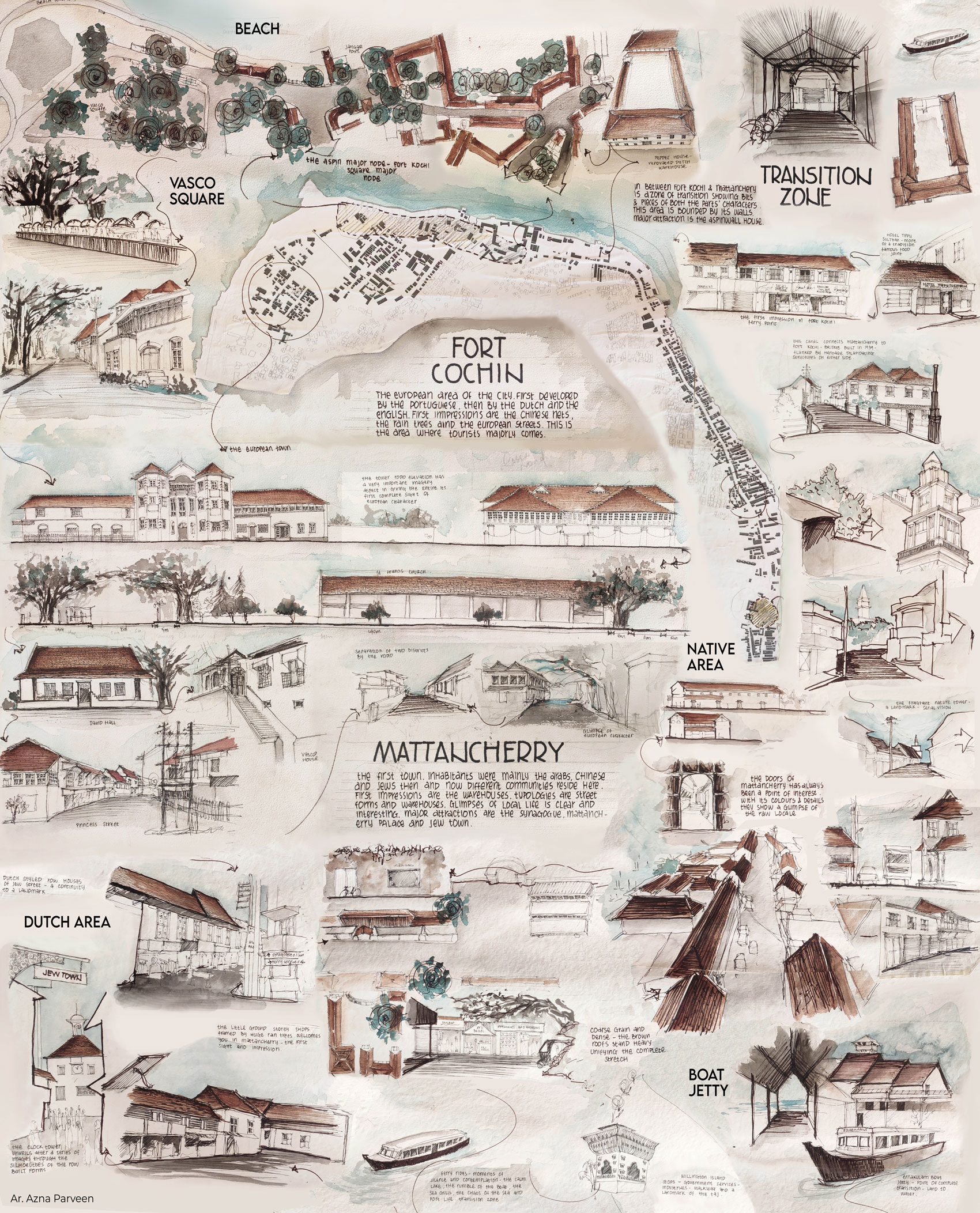 The experiential map based on Fort Kochi and Mattancherry was an integral part of an undergraduate thesis exploring ‘Manifestations of experiential aspects in Architecture’. The hand-sketched map intends to capture the experience and vibe that is distinct to Fort Kochi and Mattancherry, attracting the attention of people all around the world for many centuries now. It explores the hodological space through a narrative trail encompassing maximum experience of the place and the components that contribute to forming a cognitive space for its users – the sights, smells and sounds with the history of the place told through its architecture. The global art scenes and the present local living scenarios also find a space through morphological discussions.