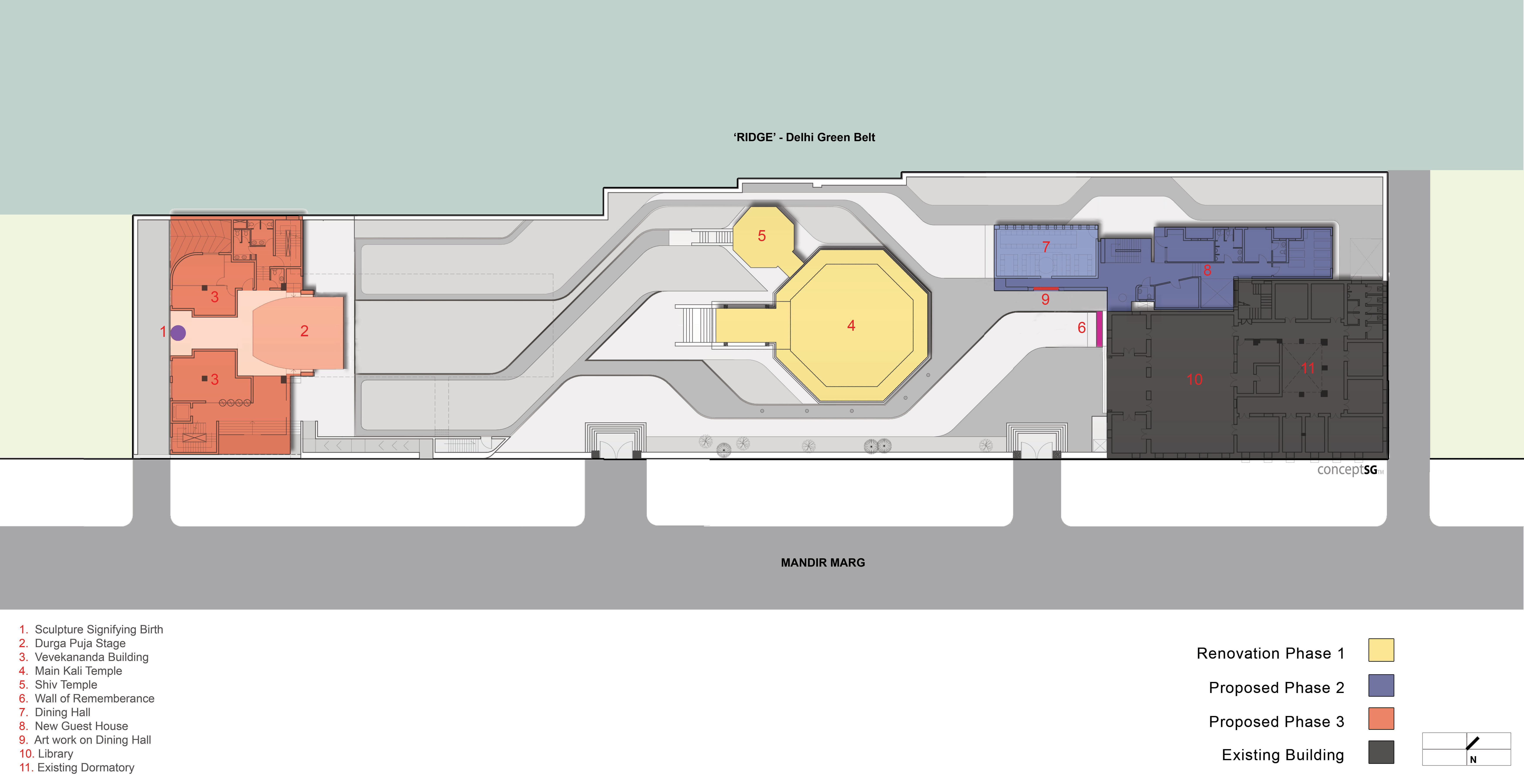 The drawing was prepared together with the 3D of the masterplan to integrate the temple, its old buildings and new buildings. One can identify the conceptual narrative as a journey starting from the sculpture of birth, moving towards the work of the Kali goddess in the central worship place and culminating at the wall of remembrance. The landscape integrates the architecture of different time periods into a holistic continuity.