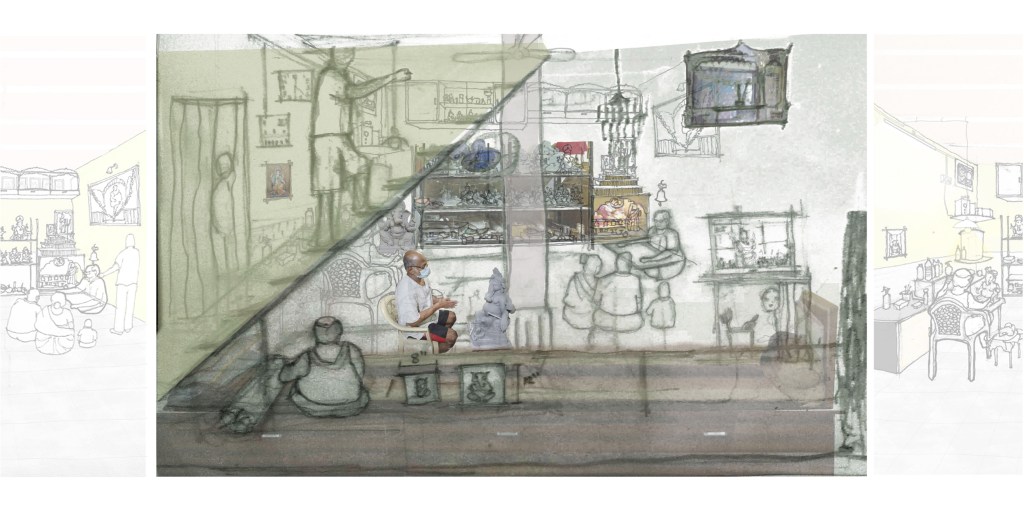Avinash Padwalkar’s home is a living collage part temple, part workshop where devotion and craft flow into each other. One corner holds his tools for carving Ganesh idols, while another becomes a sacred space for prayer. Built layer by layer, his house reflects his journey of constant learning and making. This drawing captures those overlaps of life and space through hand-drawn lines and layered textures, revealing how the neighbourhood itself becomes a teacher and collaborator in his artistic practice.