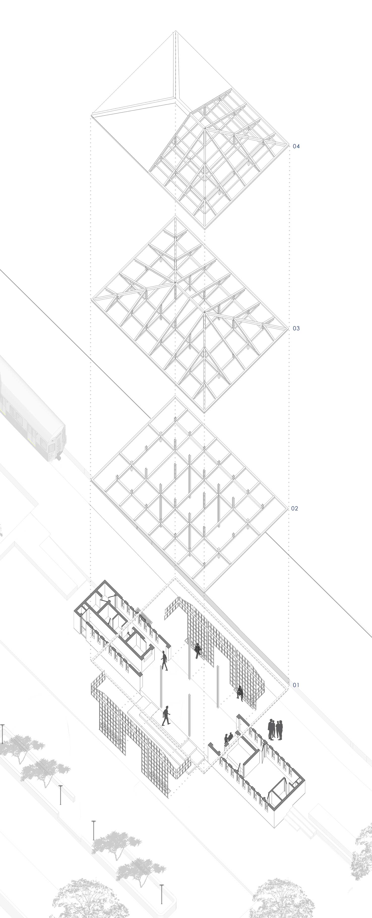 The exploded axonometric was the drawing of choice communicating the rationalistic spirit of the building. —- A train station of this size has one primary function only: provide shade and shelter to waiting passengers. Everything else is a serving function and hence the structure does mirror exactly that. Two civil blocks containing the serving functions and supporting the large shade canopy cantilevering generously.