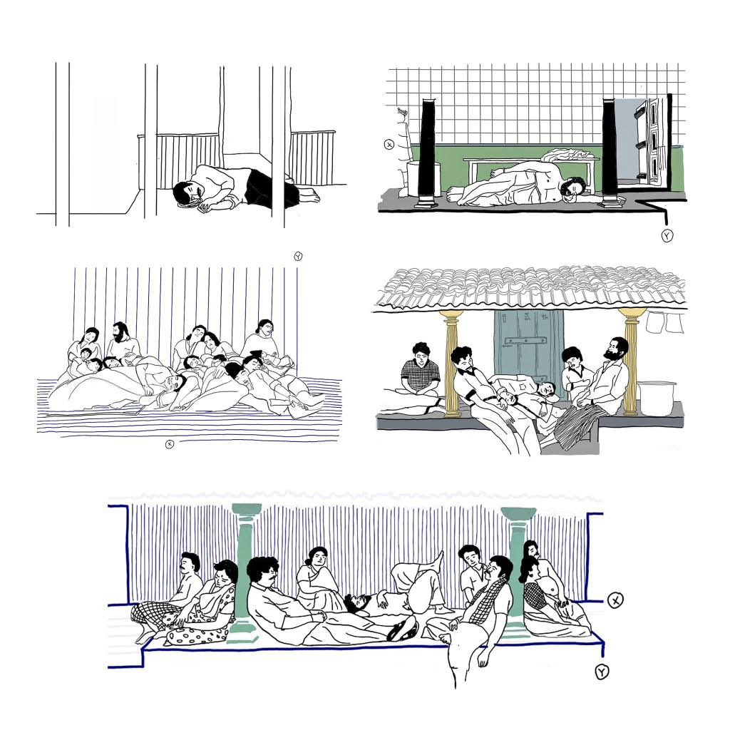Inspired by visual frames from the film Nanpakal Nerathu Mayakkam, the illustration explores everyday rest as an architectural condition. Patios are treated as planar thresholds mediating interior and exterior space, where figures articulate posture, occupation, and social rhythm. Through hand sketching combined with digital line work and subtle colour layering, the drawing functions as both analytical representation and cinematic observation, revealing how interstitial spaces structure pause, informality, and domestic life.
