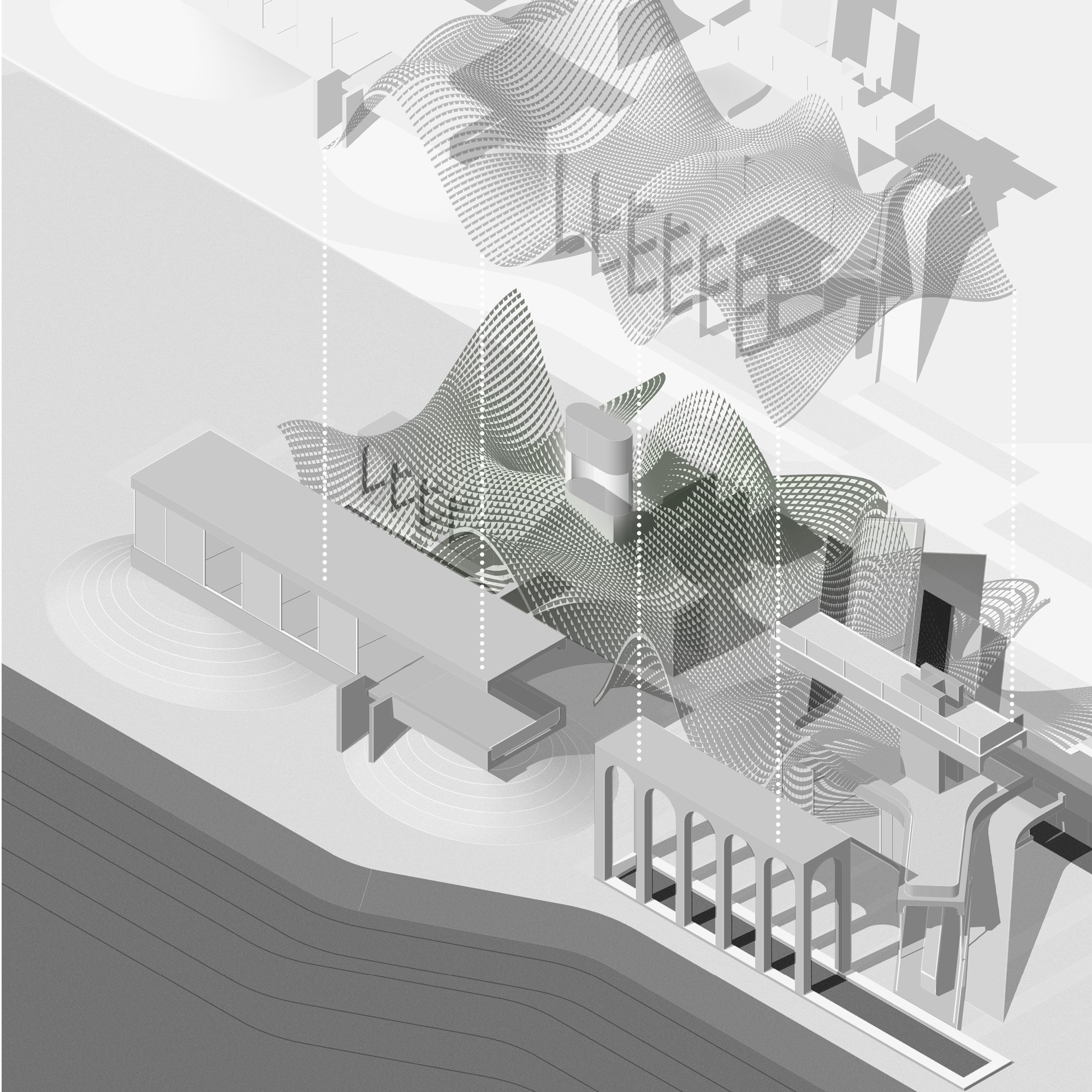 We imagined a Brutalist relic and adapted the structure to be reused as living spaces. The contrasting addition of a sinusoidal lattice roof spanning the brutalist volumes is our interpretation of how the evolution of function generates a democratic space.
