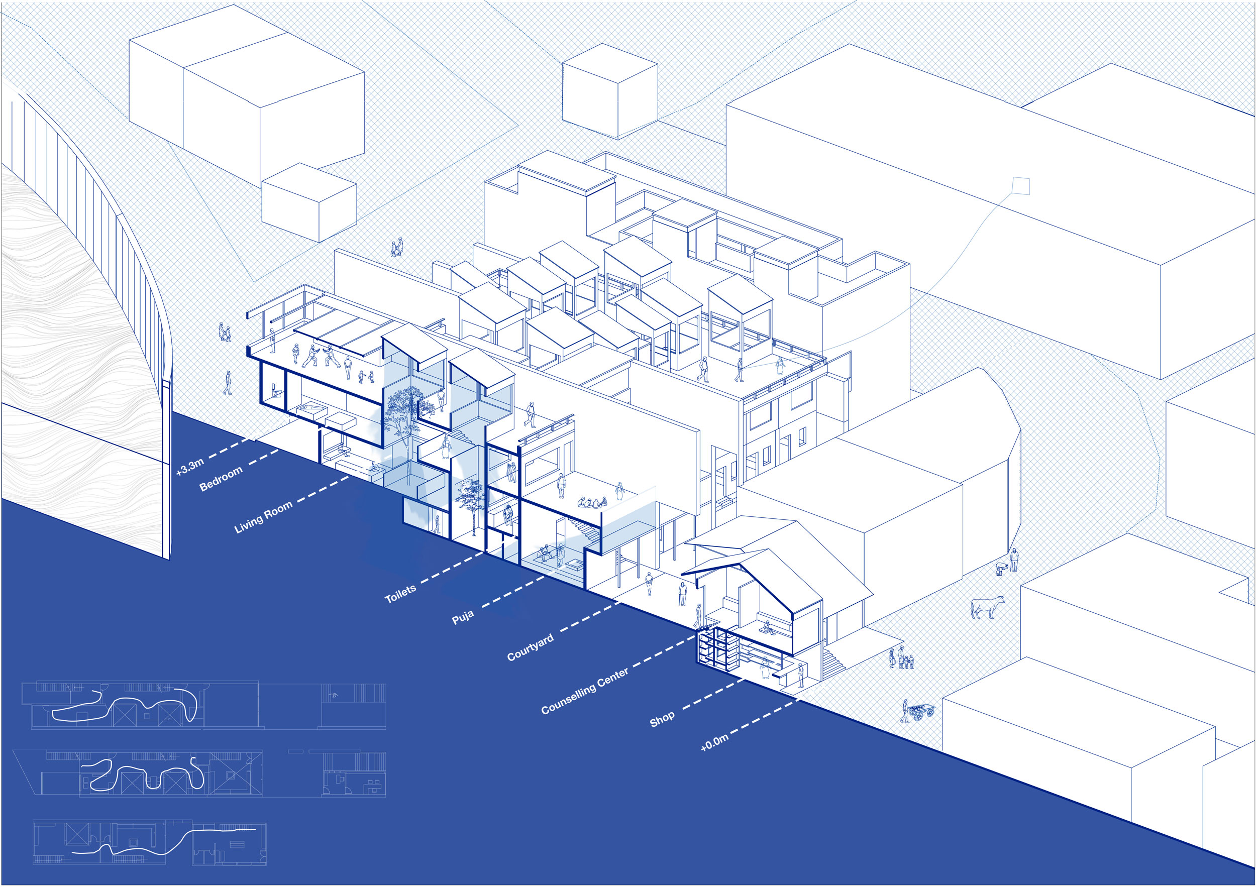 Repurposing of wadas for a new religious tourism economy with each wada accommodating the programmes of living, religiosity, entrepreneurial work practices, hospitality and recreation. The project explores the affordances of the long, linear houses which open out to a common courtyard that allows the hybridity of different programmes.