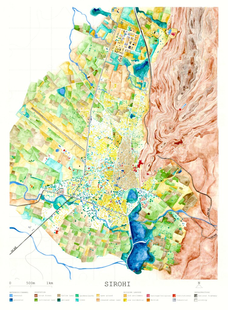 Mapping was thought to be an important tool to conduct an enquiry into the flux that Sirohi is going through – strands of deterioration and neglect in the old fabric, coupled with continuous expansion of the city periphery. This drawing was created by digitally tracing out maps available with the Nagar Parishad of Sirohi and tallied with Google Satellite images at every step. It was then printed on an A1 size sheet and hand-rendered with watercolours to depict the natural features and landuse of the region.