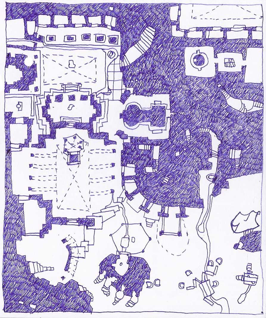 Concept sketch for the folly house, 2014. Soupy spaces are formed at the fringes of traditional or established structures ( structures would imply hierarchies, methods, associations ). Here the fragments of traditional structures remain suspended in a thick soup with their splintered edges providing opportunity for ingress of new structures.