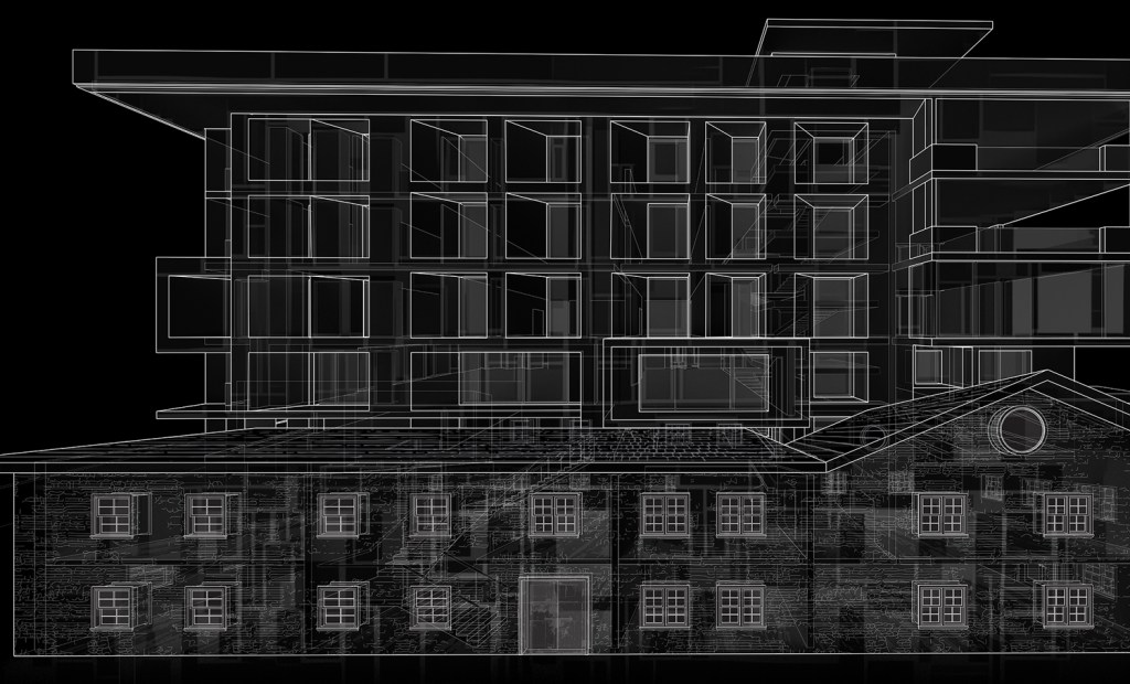 Building ruins manifests itself in an architectural section perspective drawing. The drawing depicts the mashup of two buildings – An old English building that is now demolished creeping over a contemporary multi-storey home. Overlaid with images generated by a neural network AI software, the images bridge the new and the old, and builds into the ruin. The drawings are a digital representation that uses 3 dimensional models, 2 dimensional line work and collage.
