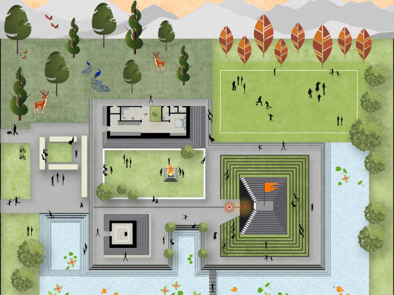 This drawing of Temple of Steps is inspired by Miniature Paintings. Well composed fusion of plan, section, elevation and 3D view with fine realistic details gives this Miniature Drawing potential to express the Architecture in relation to Life and Time happening in and around the space.