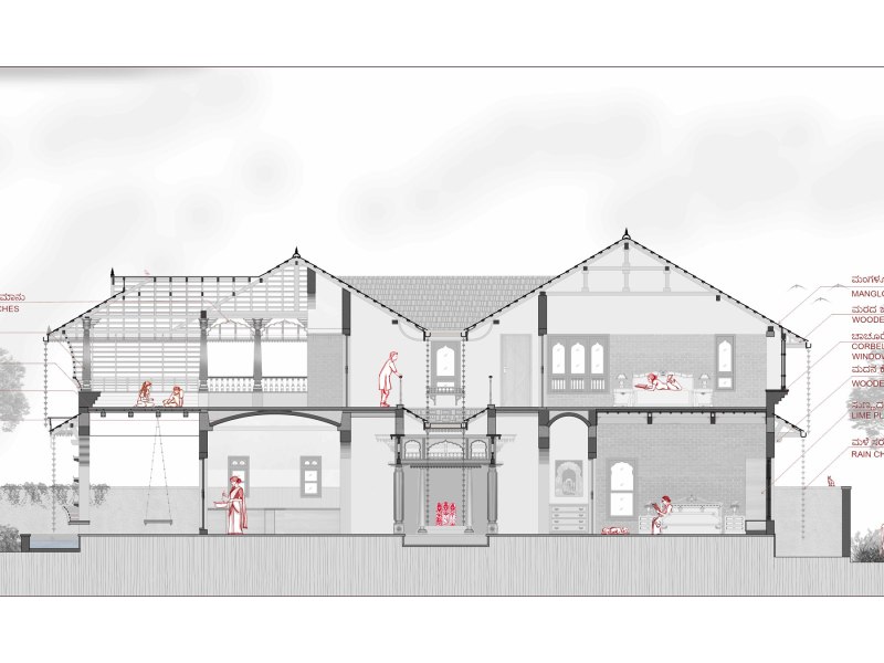 This section, along the N-S axis, showcases the stepped terrace garden, which becomes a visual extension of the park that is in front of the plot. It provides views of the sky and filtered sunlight through the windows, creating a dappled pattern of light and shadow indoors. The plants and greenery are visible through the windows from the double-height dining area, the study, and the kids’ room. The family enjoys the views of the flowers and fruits, as well as the changing colours of foliage throughout the seasons. It is also an invitation to a variety of birds, insects, and pollinators, and the family to engage with nature. The soil on the roof acts as natural thermal insulation, and the transpiration of the plants contributes to the thermal environment of the house.