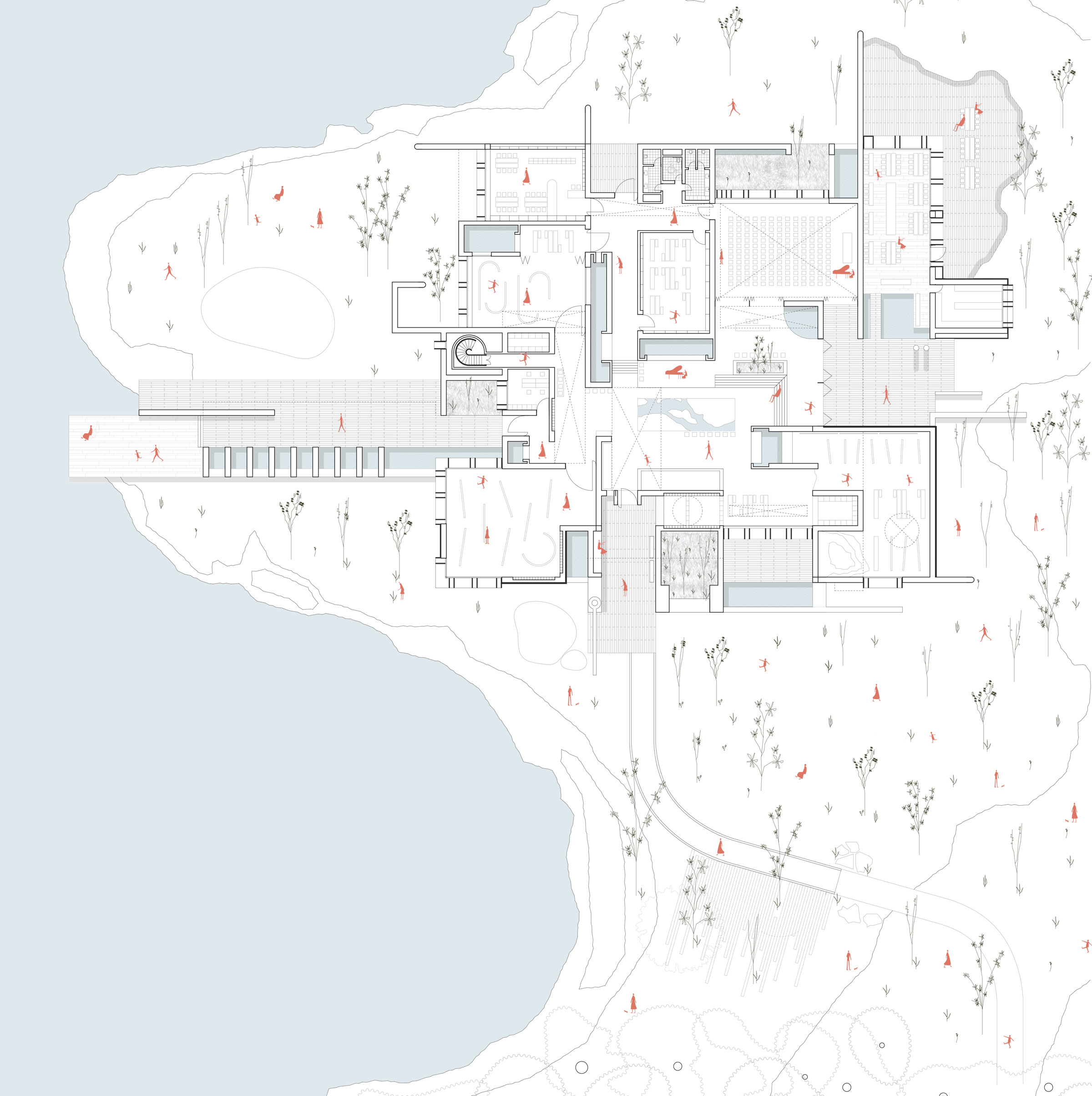The essential idea behind the project was to resonate with the built landscape of the context and reinterpret it into a hybrid of the museum and cultural centre. The centre, equipment of cultural comprehension, is born taking the advantages of the idea that geographically encompasses the country of Norway, the cluster of islands. In this context, the islands are being represented by the different programs which are interlinked to each other by bridges with water and skylights sequestering them from each other. The functional blocks and common spaces emerge from the earth creating landmarks in the tectonic landscape with water flowing through them conceiving the islands of Norway in the built form. The uniquely shaped blocks of the program creates a dialogue in between the landscape and built form, as they emerge from the tectonic plane, while waterway flows through and around it to divide the volumes and openings all around it ensures that the dynamic view of the lake and the forest is unhindered.