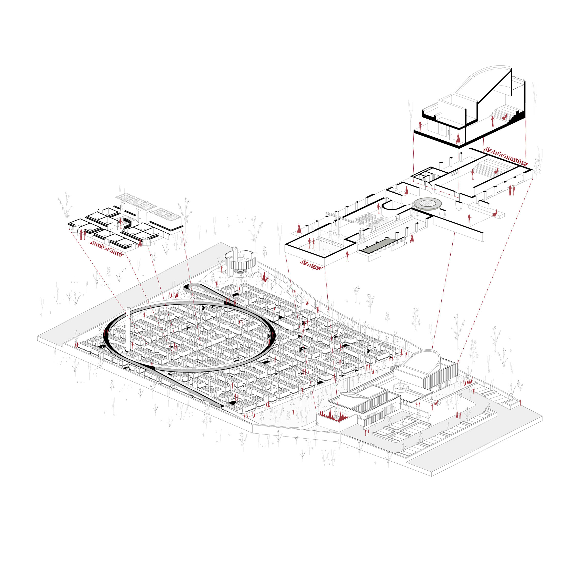 A person visiting their loved ones ends his journey through the walkway designed at a height above the tombs from which the whole garden can be viewed with the built form acting as a backdrop here. In this way, the balance of grief and peacefulness is achieved. The 13m high column stands tall around which the circle of remembrance rotates while the Pavilion of Silence marks the end cluster.