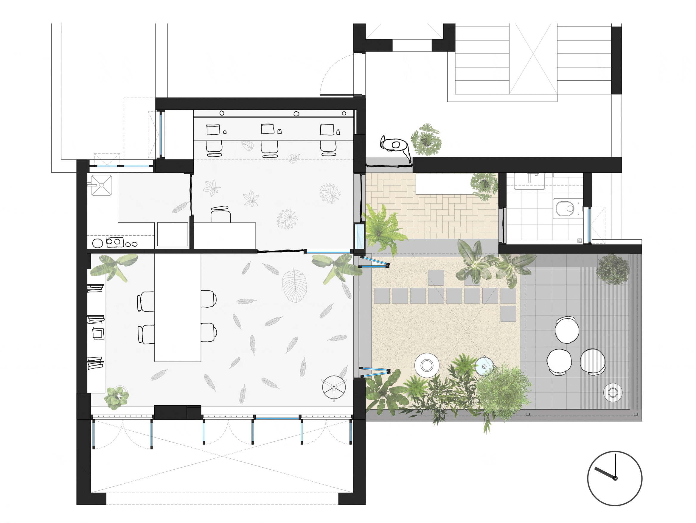 Wrapped within leafy surrounds of the city, this architectural studio is an effort to manifest our ethics and aesthetics into physical reality. The studio is located within a quieter nook of an otherwise bustling neighbourhood in Pune, India. The humble area of 550sqft tries to bring harmony through simple and efficient workspaces. The idea was to translate the essence of having a studio on ground with greens and gravel, onto a terrace garden. To weave a workspace alongside an open court, skylight and large openings to facilitate maximum use of natural light was the key concept behind this project. The spaces are crafted with an intent to serve functionality and provide a humble and humane scale. We tried using materials in their true nature, texture and colour. Muted tones, subtleness and earthy textures are an expression that inspires this space. This narrative of design seeks to create a tropical and ruminative experience. The sound of trickling water, the richness of foliage, and the sway of light and shadow, make an effort to bring this space to life. This office space has truly been ‘the raw canvas’ to experiment, innovate and explore the ideologies of the studio, which can foster a vibrant and positive environment for the users as well as the visitors.