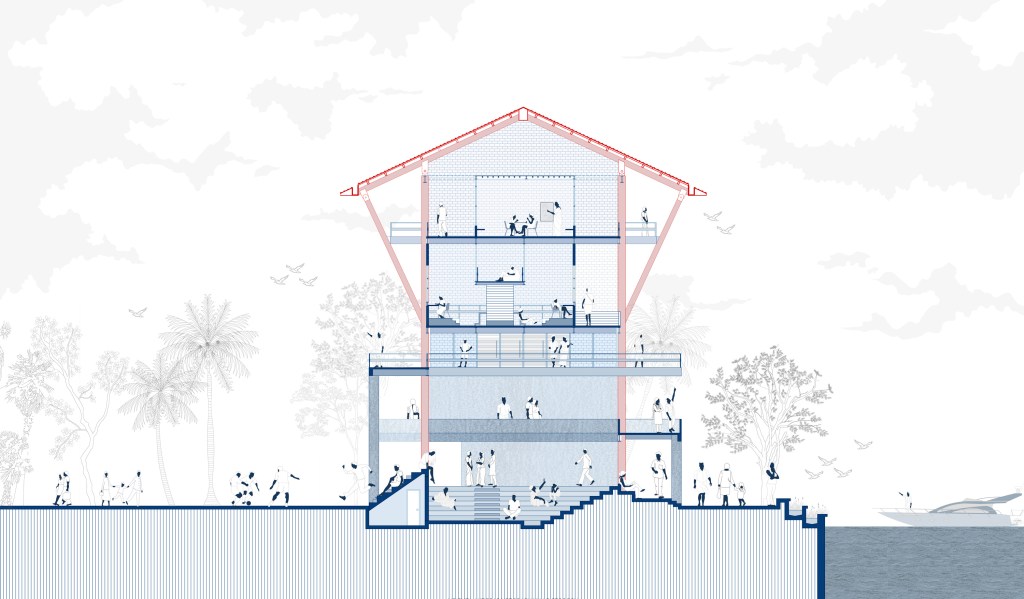 The drawing attempts to represent the idea of the building becoming a threshold between the water edge and the city beyond. The building throughout its ground level acts as a threshold into viewing the water edge along with ancillary functions which are temporal in nature. The drawing very strongly tries to communicate that the building is imagined as a bar with an arm extending into the city as well as the island beyond. It chooses to leave behind most of the site back as a bare ground which the city uses as a public space or as a space to hold temporary events etc. A vibrant urban life is expressed through the colours chosen for the drawing where people occupy the space to their own comfort. The method of drawing, the perspective chosen is specific to convey that building creates a world within and around it. The cross section of the project supports the drawing for a better understanding