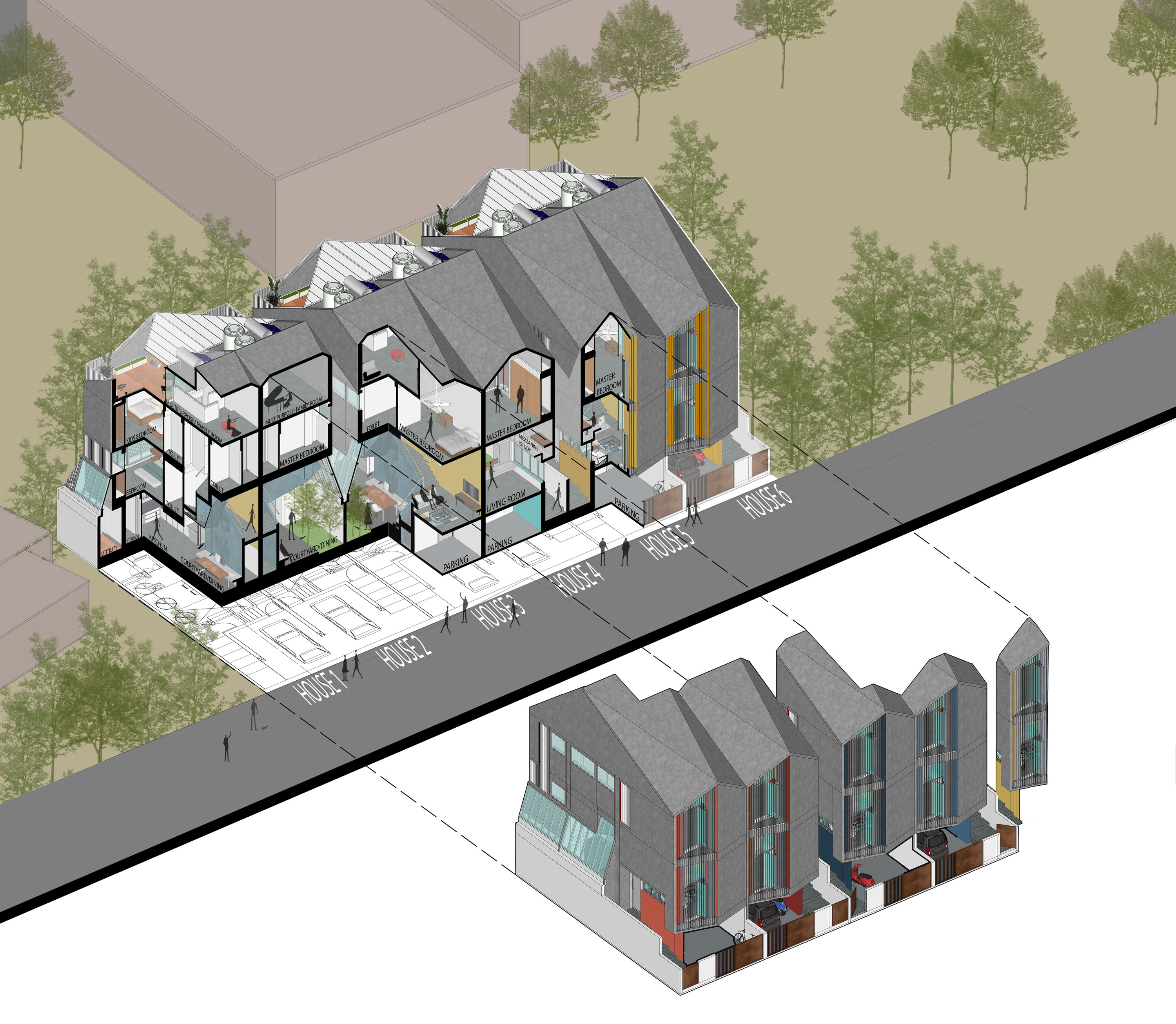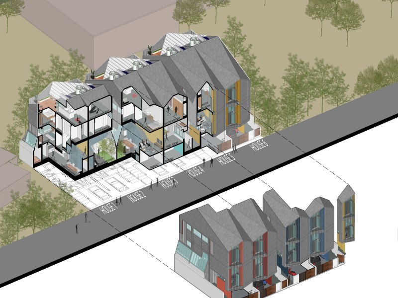 By diagonally slicing through the six houses, different parts of the design are uncovered in a sequential manner, revealing its inner organisation as one would cut a slice to examine a layered cake that is deceptively simple from the outside while containing a degree of sophistication and complexity within.