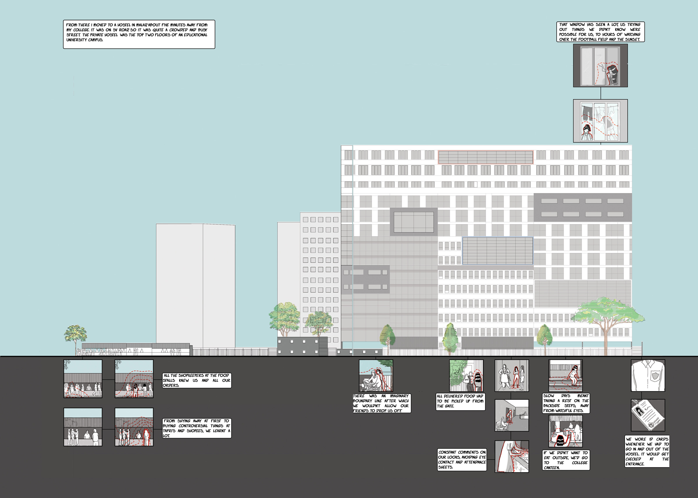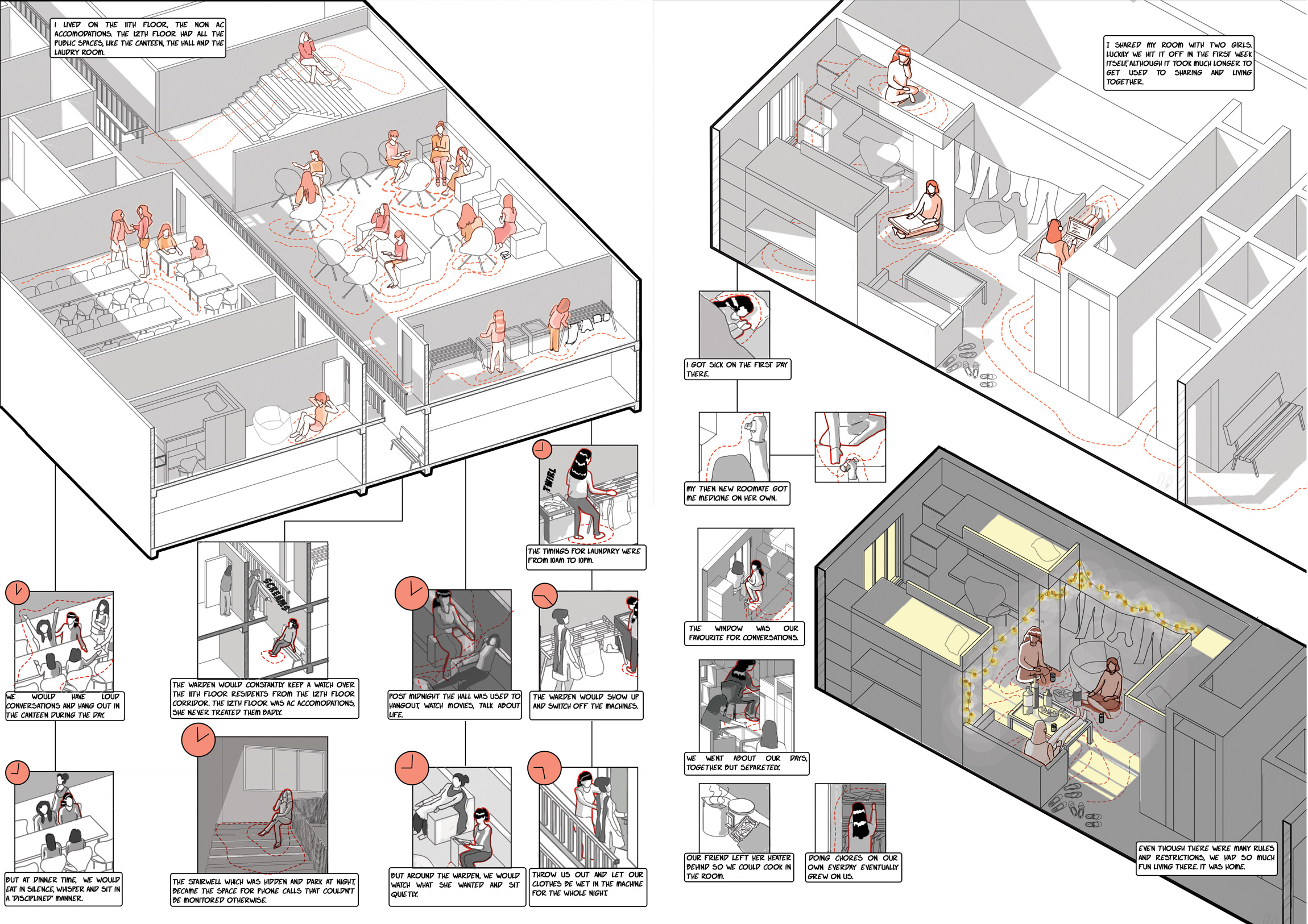 How do women make home in the city? With the changing times, an increased migration of women has been observed within the country especially to the various work forces in the city. It’s crucial to understand how women make home in this migration process through the lens of gender. How does the gender role of being a woman and its subsequent social scripting affect the way women go through home-making processes? Through the fieldwork, I mapped various kinds of places, social structures and practices of oppression and transgression that women are faced with when they try to make space for themselves. The drawing methodology explores a graphical comic book narrative – inspired by Building Stories, to capture the vulnerable interviews and conversations with the research subjects. The story board and scenes are built through Virginia Woolf’s stream of consciousness method layered with demarcations of claims, dialogue, time and spatial home making practices.